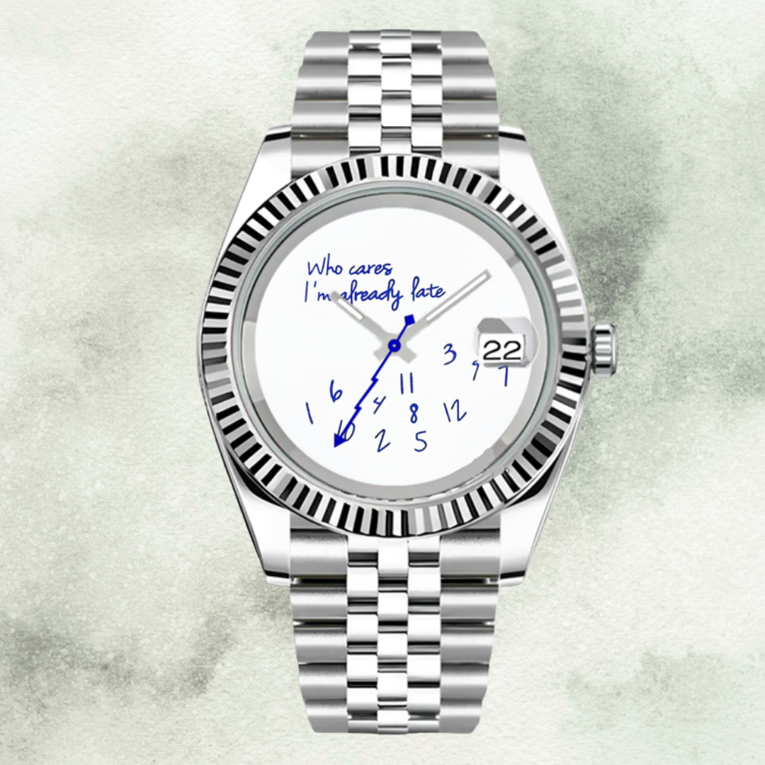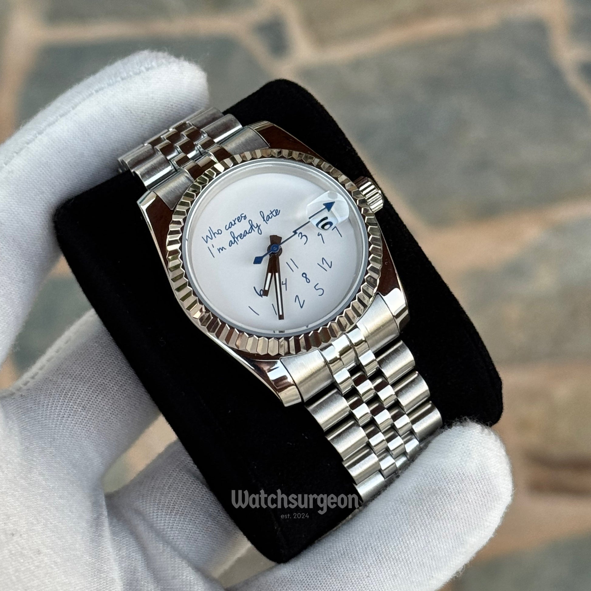 Custom Seiko 'Who cares,I'm already late' White/Blue Dial